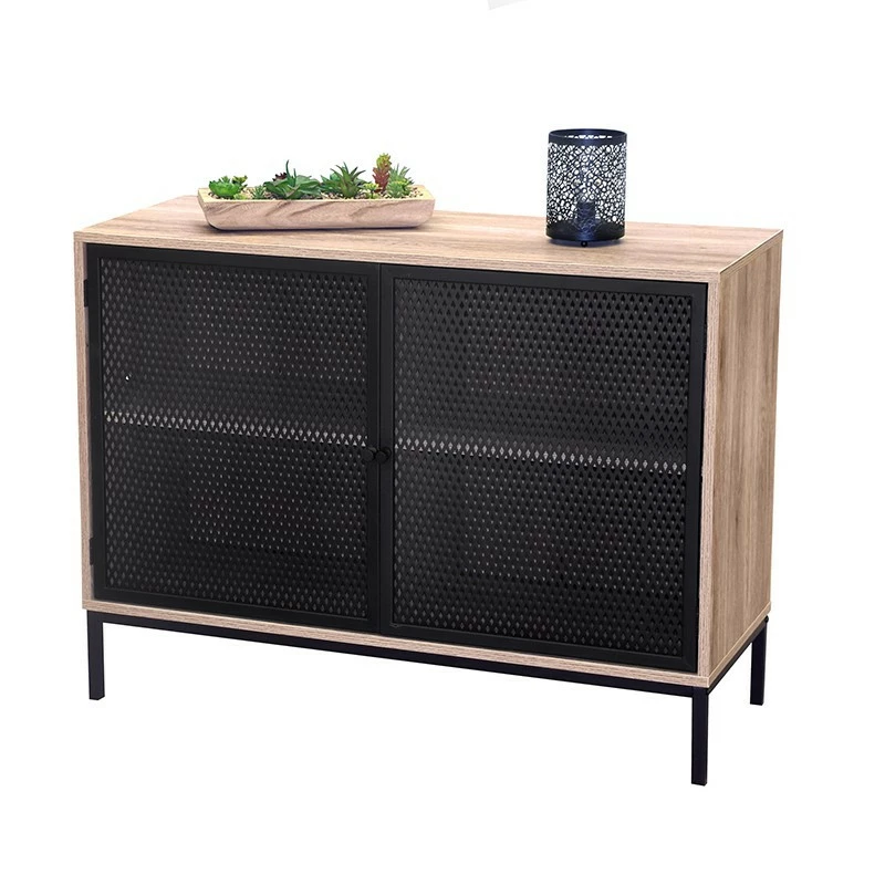 Buffet en mĂ©tal et imitation bois de hauteur 75 cm. Ce buffet est composĂ© de deux portes effet grillage avec Ă©tagère intĂ©rieure. IdĂ©al pour ranger votre vaisselle par exemple.Â