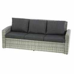 Ce canapé est conçu spécialement pour l’extérieur : sa structure est en aluminium traité époxy antirouille, son habillage est en résine synthétique tressée et ses coussins sont en polyester 180 g/m² traités déperlant et déhoussables.