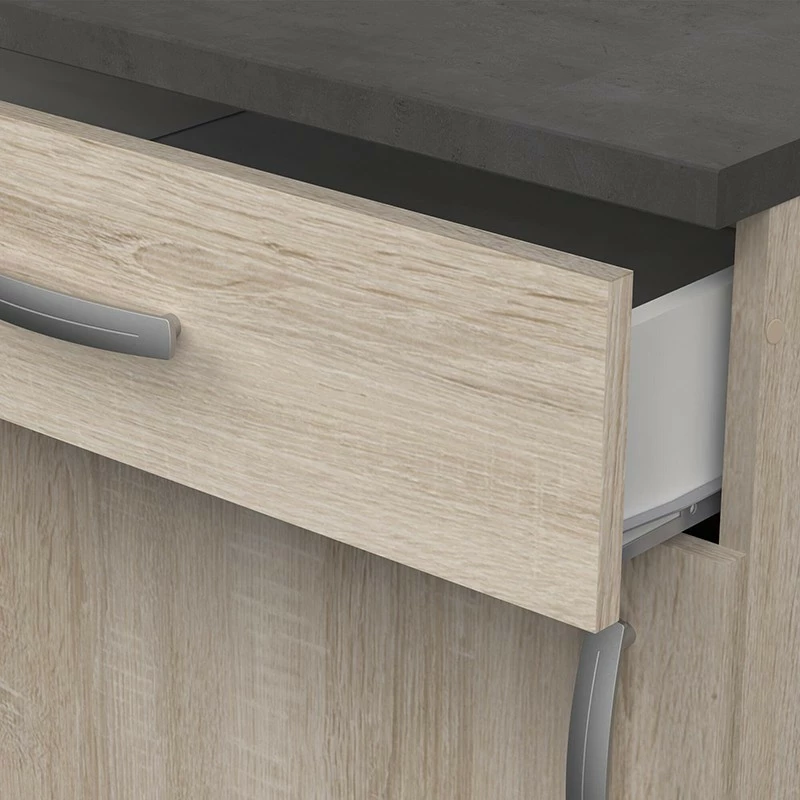 Le coloris chĂŞne brossĂ© s’accorde parfaitement avec le plan de travail coloris gris bĂ©ton.Â