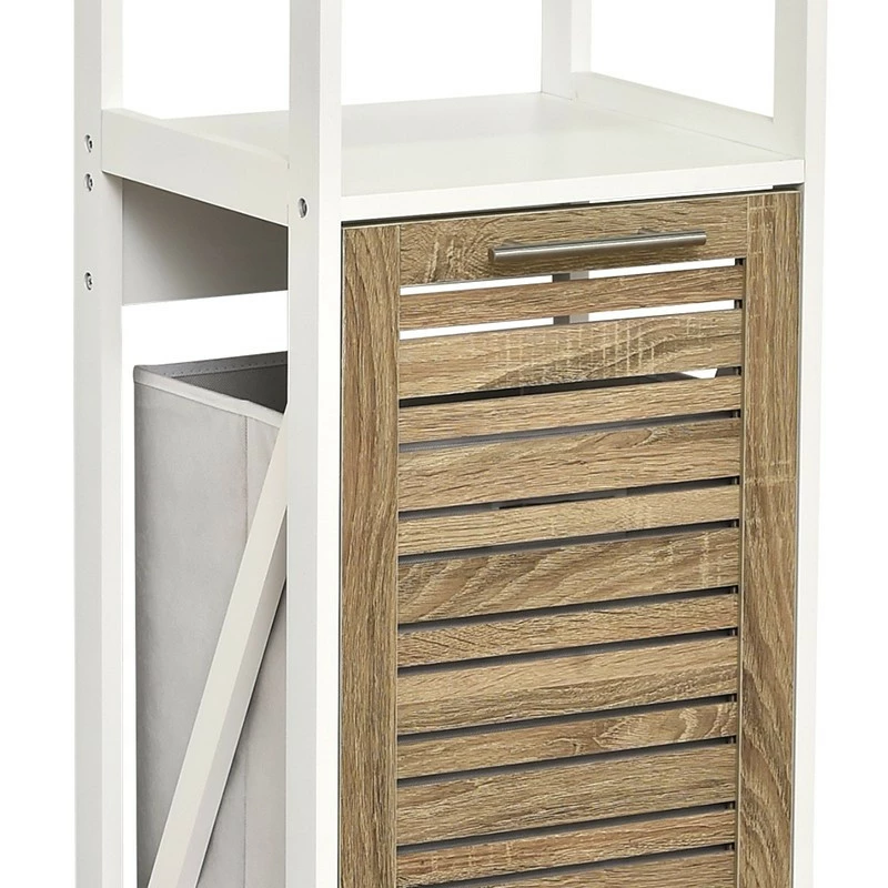 Meuble bas avec étagère et panier à linge de la collection Stockholm. Ce meuble de salle de bain permet d’apporter du rangement tout en cachant le panier à linge souvent peu esthétique dans votre salle de bain.