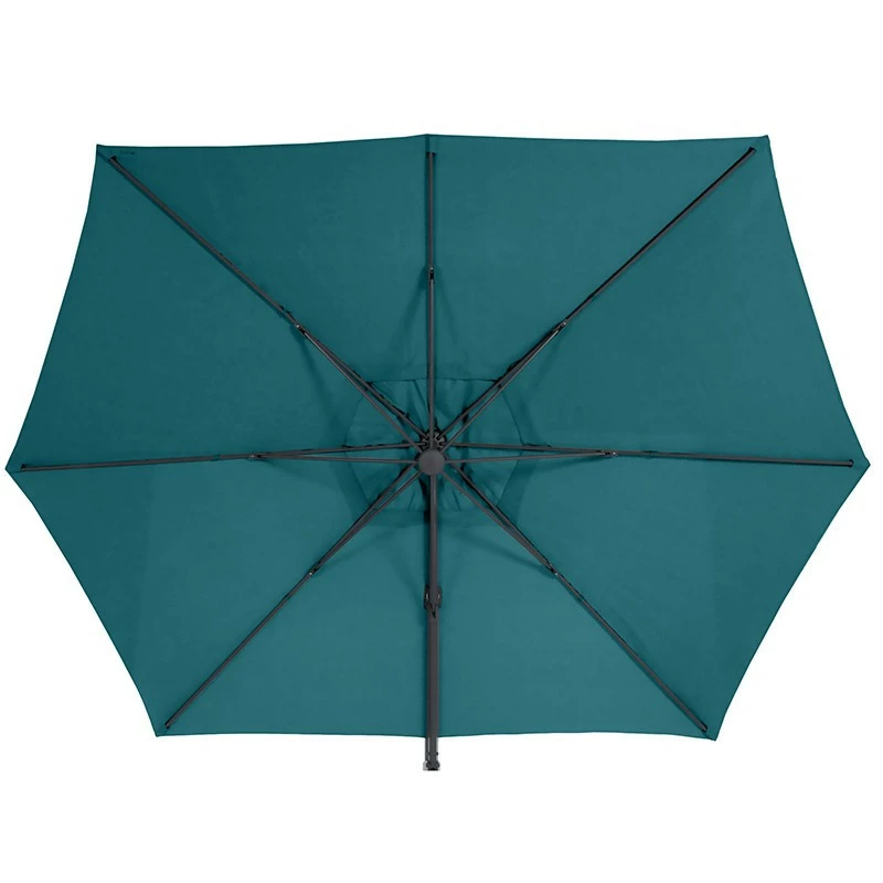 Protégez vous du soleil tout au long de la journée grâce au parasol décentré Eléa hexagonal inclinable coloris bleu canard de la marque Hespéride.