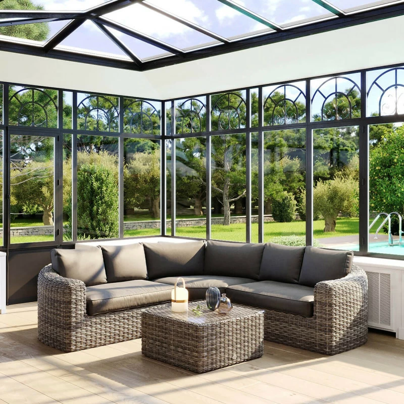 Le salon Mooréa dispose d’une structure en aluminium traité époxy antirouille habillée de résine synthétique tressée.