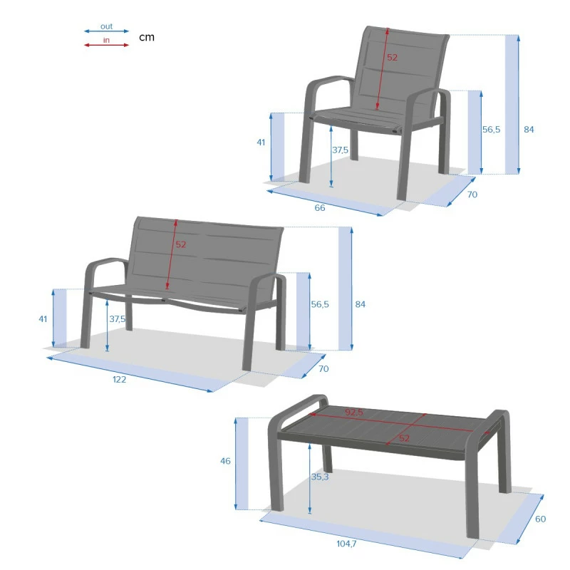 Assise matelassée pour un confort optimal avec séchage rapide traitée contre la décoloration. Structure en aluminium traitée époxy antirouille.