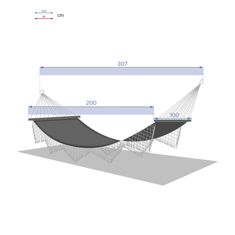 Hamac vendu seul sans support. Hamac à suspendre composé d’une toile coloris blanc et décor et de 2 barres en bois coloris naturel.